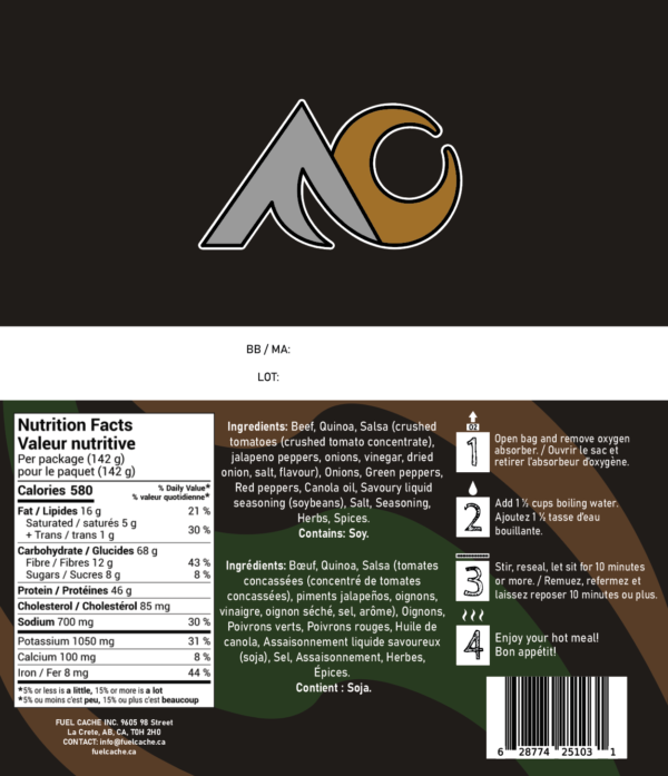 Ingredients: Beef, Quinoa, Salsa (crushed tomatoes (crushed tomato concentrate), jalapeno peppers, onions, vinegar, dried onion, salt, flavour), Onions, Green peppers, Red peppers, Canola oil, Savoury liquid seasoning (soybeans), Salt, Seasoning, Herbs, Spices.